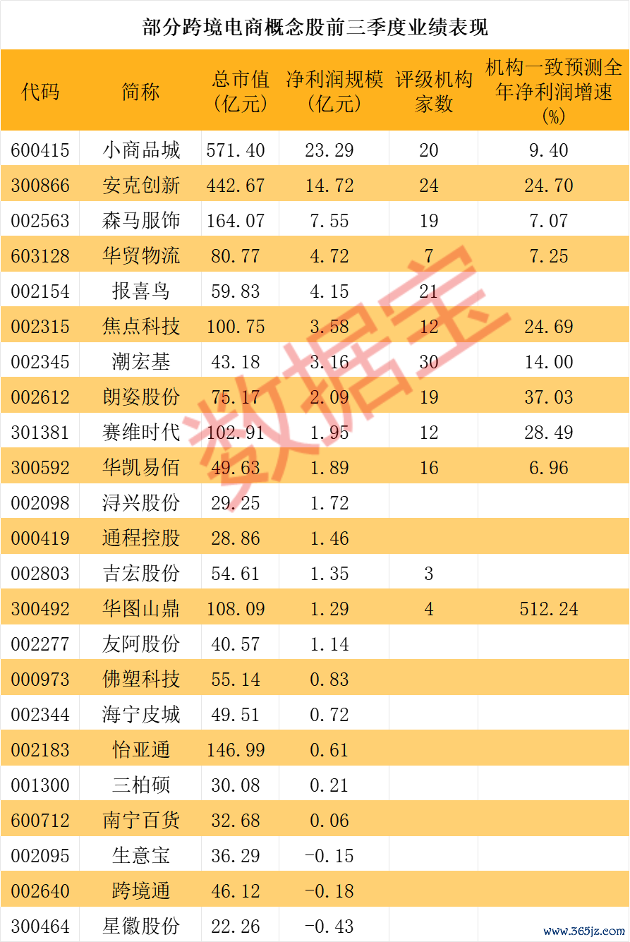 从业绩看,18股今年前三季度净利润过亿元,小商品城、安克创新、森马服饰净利润高于5亿元。小商品城实现营收106.13亿元,同比增长34.25%;归母净利润23.29亿元,同比增长0.53%。